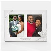 The Engraved Lenox "True Love" Double Picture Frame from trusted brand Lenox is even more beautiful with your engraved message. From their "True Love" collection, the design features two hearts in the lower right corner and a wrapped ribbon detail sculpted in silver metal. We'll add your personal message above or below the photos; we suggest their names, wedding or anniversary date, or a heart-felt note. They'll love to see their favorite wedding or family photos on display with such love and care.