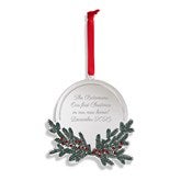 Commemorate life’s most special holiday moments with this elegant Wreath ornament. Crafted with a gleaming silver-tone frame, it features beautifully detailed pine branches and clusters of bright red berries, perfectly accented by a classic red hanging ribbon. At the center, a polished silver plate offers space for your personalized message — ideal for marking a first Christmas in a new home, welcoming a new family member, or celebrating a meaningful milestone.